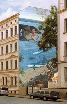 Wir bemalen Immobilien jeglicher Art im Innen- und Außenbereich. Sowohl eigene, freie künstlerische Entwürfe, wie auch Zweckbezogene Vorgaben des Auftraggebers können Ausgangspunkt für die Gestaltung einer Immobilie sein. Beispiel: Giebelgestaltung Gneisenaustraße 2 in Leipzig (in Planung/ Entwürfe), Gibelbemalung am Elefantenhaus im Zoo Leipzig und die Bemalung zweier innenliegender Giebel im Kinderbereich des Freizeitbades H2O Herford.